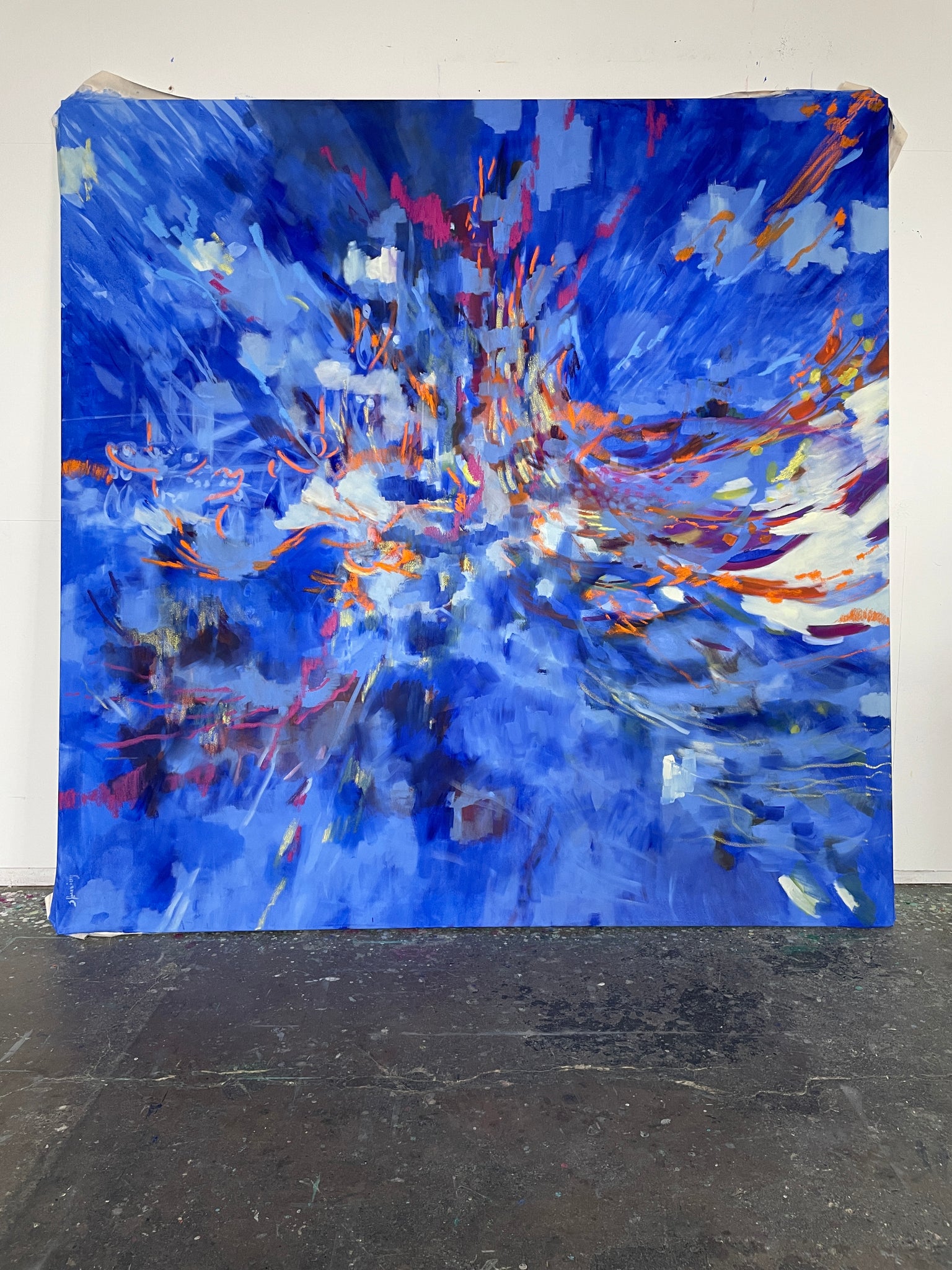 Mein Großformat "Rays" ist Symbol für die Kraft unserer Gedanken. Kräftige Pinselstriche in leuchtenden und bunten Farben streben expressiv auseinander auf einem leuchtend blauen Hintergrund. Die Strahlen und Lichtpunkte spiegeln und brechen sich wie das Licht in Kristallen oder in feinen Wassertropfen. Unsere Aufgabe ist es unsere Ideen und Gedanken zu teilen, in Austausch zu kommen. Manches Mal halten wir uns vielleicht für zu unbedeutend, oder wir wissen ganz genau, dass was wir einbringen wollen absolut nicht in angeblich allgemein gültige oder gesellschaftsfähige Normen passt. Es ist unbequem, groß, sperrig, erscheint zu laut. Dies bedeutet Bewegung, Vorankommen und Mut.