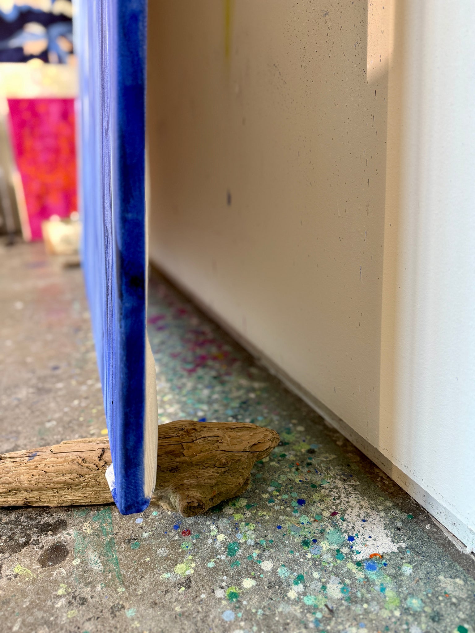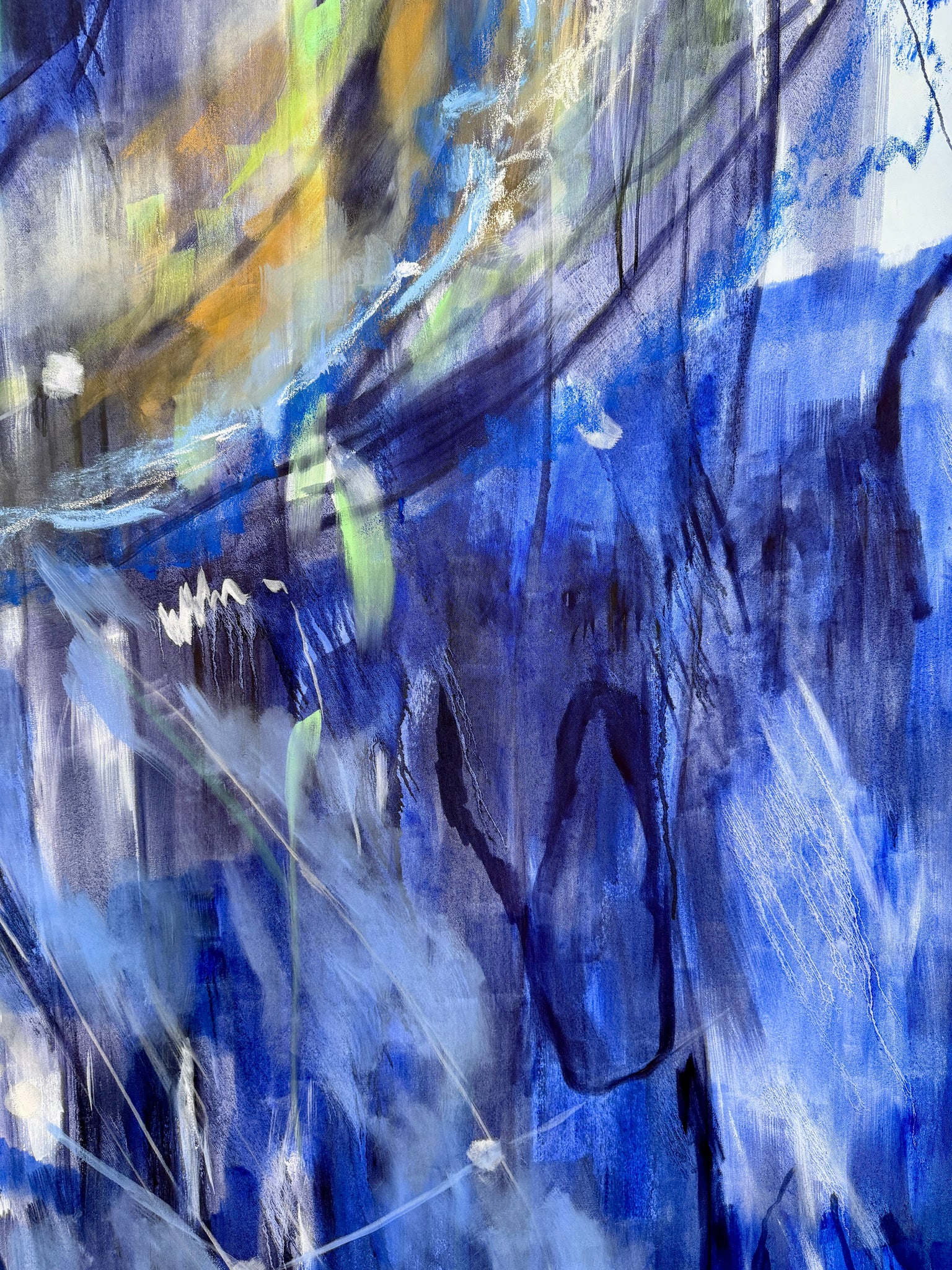 Das großformatige Werk Weltenwandler aus meiner Gemäldeserie LIVING SHAPES erzählt die Vision einer fluiden, futuristischen Welt. In dieser ist es möglich zwischen den Welten zu wandeln. Die Farben und Formen fließen wie lebendige Energien. Intensive Blautöne stehen für den Kosmos, Tiefe und Emotion. Expressive Linien und Farbfelder formulieren Veränderung und Transformation. Ein geflügeltes Pferd nach links ist zu entdecken. Es ist ein Symbol für Dynamik und Veränderung der Richtung oder auch des Zustandes des Seins und gleichzeitig eine Anspielung auf die Geschichte des Pegasus aus der griechischen Mythologie. Das Gemälde bringt eine lebendige, inspirierende Energie in jeden Raum und lädt den Betrachter ein, sich in eine neue, unendliche Realität zu träumen. Das Gemälde ist auf der Vorderseite und rückseitig signiert.
